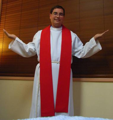As Priest we wear red exactly as the Priest in the picture for certain celebrations as a symbolic representation of passion and Blood of Christ.