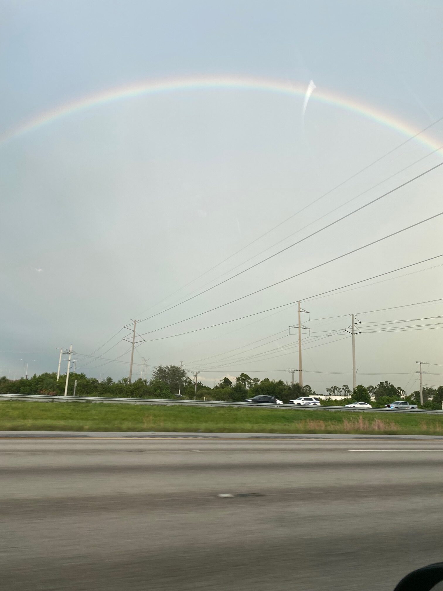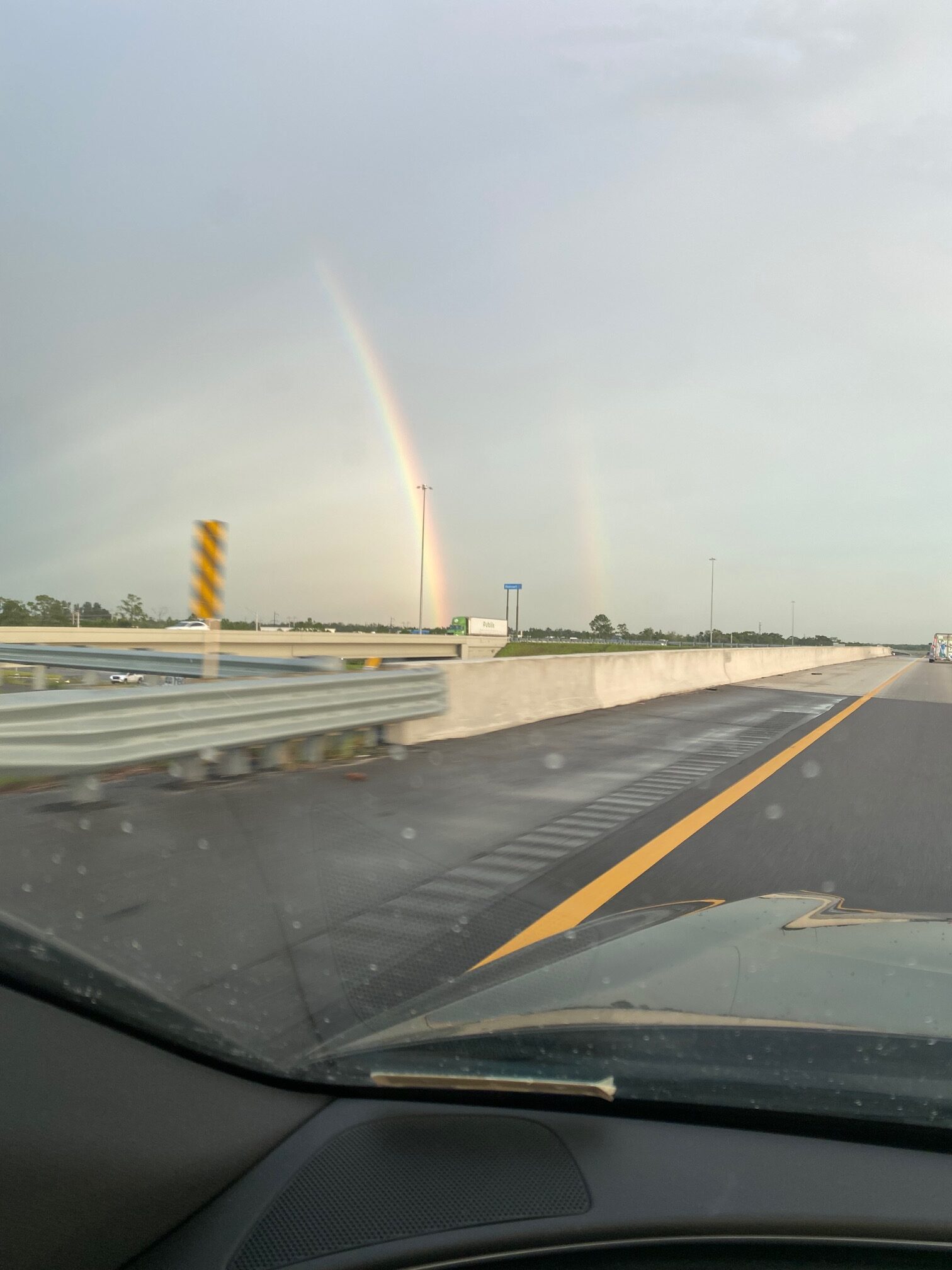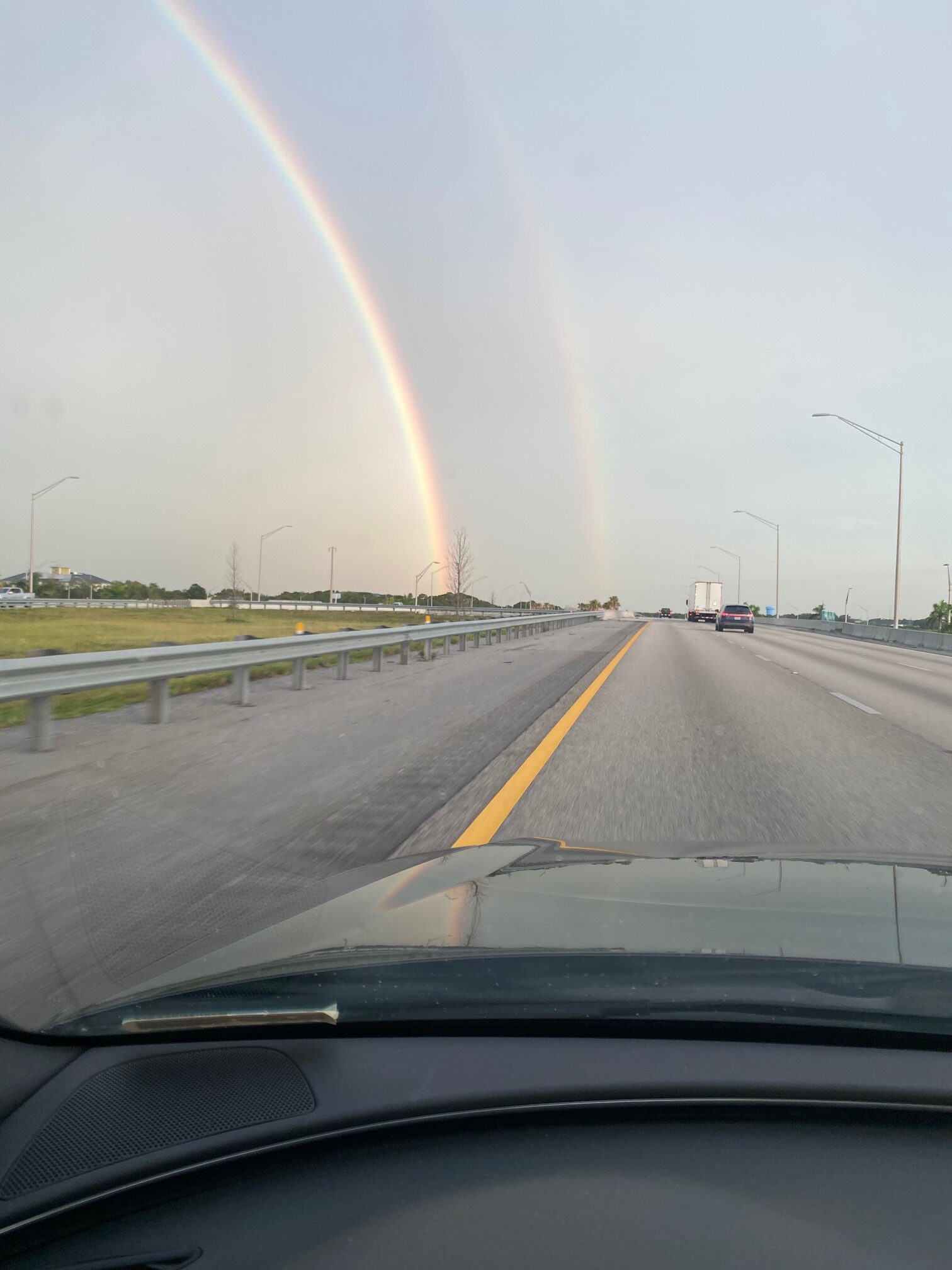 As we kept driving and the car moved along the highway, we lost track of the rainbow. I thought that was the end of it. Until I saw two more rainbows, so then I pointed them out to my daughter. I said, “look there are two more rainbows over there” A few seconds later she says to me “Mommy, those are not two more rainbows those are the same rainbows, it’s just the end of the rainbow. Notice that it is arching to the left”
