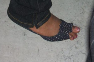 I see this woman dressed in a black dress like she’ll either coming from or going to a funeral because she had a veil over her face as well. When I look down on her feet she’s wearing closed toe shoes but it appears that she has outgrown the shoes so instead of buying new shoes she cuts a hole in the front of the shoes and her toes are hanging out.