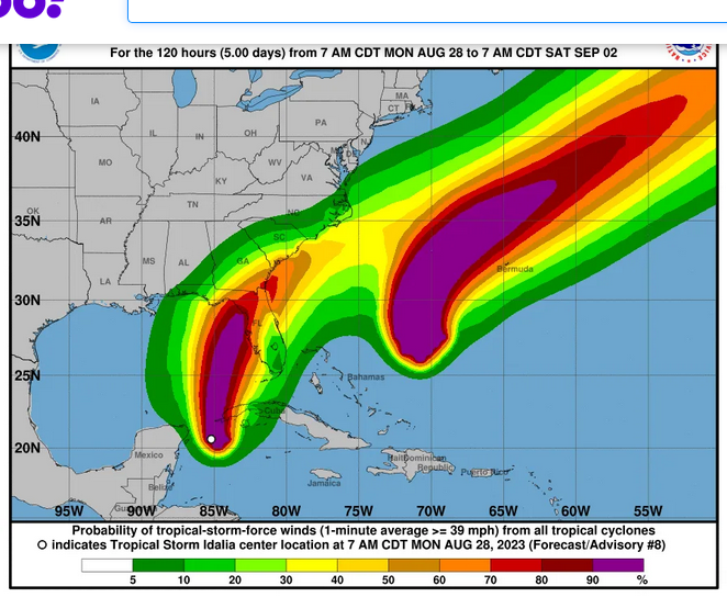 This map is of the United States, the Southeast corner.  There were 2 storms/hurricanes, the one on the right of the United States is Franklin and the one off the left is Idalia.  I looked at this image and immediately the post about promises fulfilled came to mind and I saw these as rainbows.  Double rainbows. The beginning of the double rainbow.  The sign of the beginning of the storm for the United States.