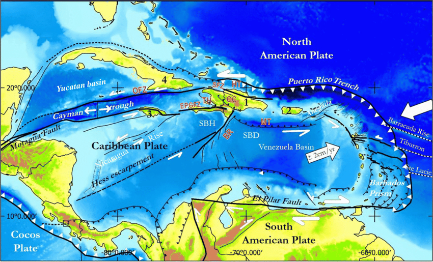 Tsunami waves are created when the tectonic plates shift and/or there’s some type of earthquake on the fault lines. This is a map of the Caribbean tectonic plate and the fault lines. The islands that are in the center top of the picture going off to the left is the Bahamas. That larger land mass on the left side coming down is the United States.