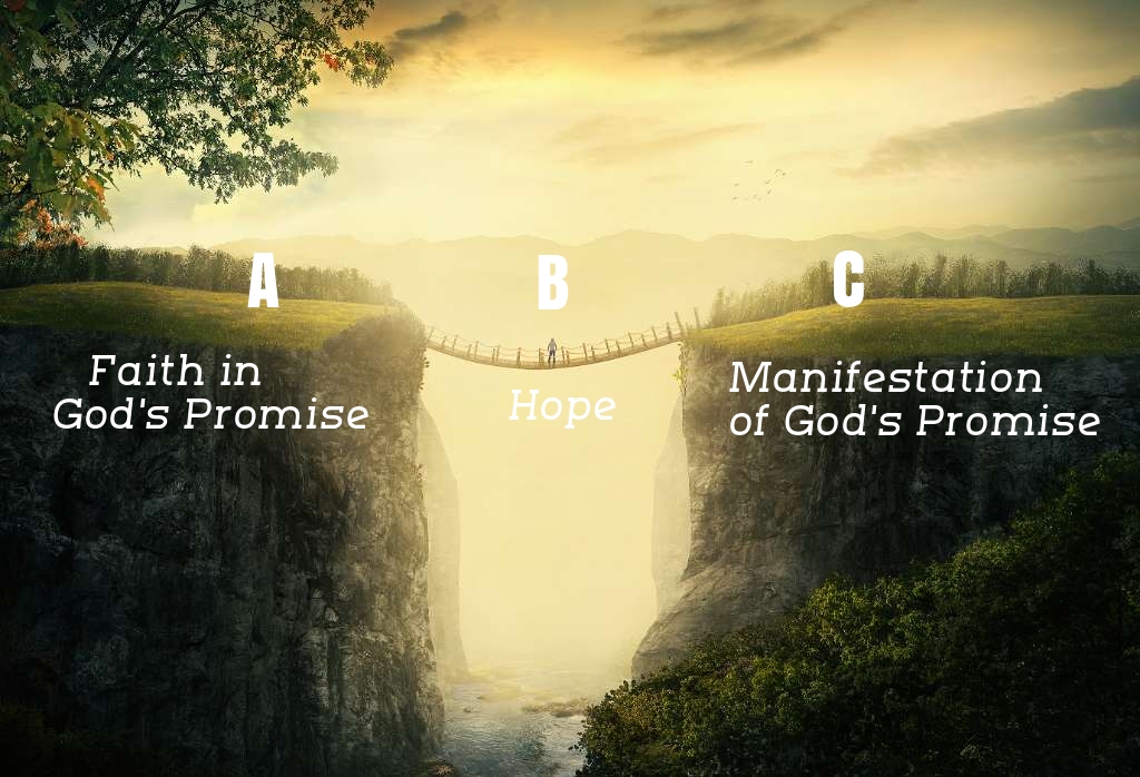 I’m going to share a picture with you that God showed me years ago of how it works. There are 3 points A, B C. Point A is when you just received a promise from God. Because He is God you believe Him when He tells you He is going to do something. This is faith. You walk in the direction He tells you to see the Manifestation of that Promise, which is Point C. In order for you to get from Point A to Point C, you need to cross a bridge called Hope, this is Point B. You have to continue in Hope in order to see the manifestation.
