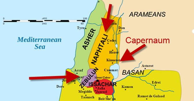 But here is the interesting thing, if you look at the allocation of the land, it appears that Zebulun (in purple) is completely landlocked and doesn’t have any connection the sea – Galilee or the Mediterranean.